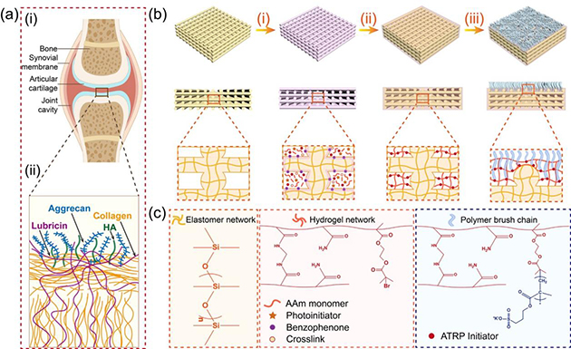 天然关节软骨由于其渗透性的表面润滑生物大分子和良好的机械耐受性,显示出低摩擦、高承载和优异的抗磨损性能。然而,由于磨损、疾病以及外伤等因素的影响,关节软骨不可避免地会受到一定的损坏。水凝胶表面摩擦力低、生物相容性良好,被认为是天然软骨的潜在替代材料。然而,传统的水凝胶材料机械性能较差,受压剪切过程很容易发生弹性变性(特别是在球-面接触工况下),即缺乏有效的力学网络支撑结构和能量耗散途径,限制了其工程应用。