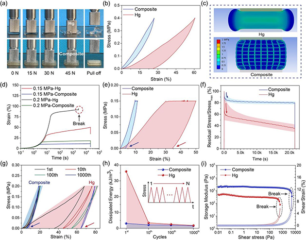 机械性能表征表明,Composite-LP表现出良好的力学性能,如弹性恢复、抗蠕变、抗疲劳以及抗冲击性等(图2,图3),这是因为三维弹性支架可以分散应力并储存施加在样品上的弹性能量。这种非耗散性机制没有利用牺牲网络或断裂键来耗散能量。此外,将非耗散机制和界面润滑策略相结合,不仅大幅度降低了凝胶相的机械变形,而且使Composite-LP在动态剪切过程中具有卓越的减摩功能和耐磨性。这种新的材料设计理念有望在仿生润滑领域得到应用(图4)。