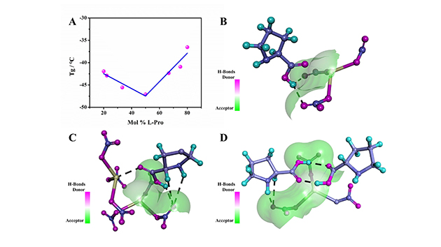 图1. L-脯氨酸与六水合硝酸铈以不同的摩尔比形成的混合物的玻璃化转变温度及三维结合模式图