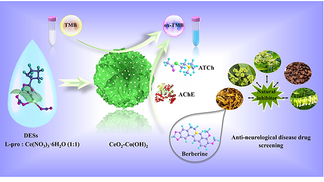 研究人员以摩尔比为1:1的L-脯氨酸和六水合硝酸铈组成的DES为溶剂、反应物和模板,制备出CeO2-Co(OH)2复合材料。结果表明,与水溶液中制备的CeO2、Co(OH)2和CeO2-Co(OH)2材料相比,在该DES中制备的CeO2-Co(OH)2复合材料具有更显著的类氧化酶活性,这主要是由于DES中制得的CeO2-Co(OH)2具有丰富的氧空位。基于CeO2-Co(OH)2纳米材料优异的类氧化酶活性,构建了可视化检测乙酰胆碱酯酶活性和不可逆抑制剂筛选的新方法。