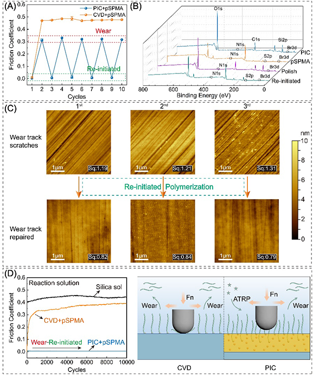 当接枝的聚合物刷磨损后,PIC仍可以触发新的聚合反应(图3)。与传统的表面接枝聚合方法相比,该涂层的引发剂存在于整个无机层中,高机械强度的无机层可保护引发剂不易被磨损。在接枝聚合物刷时,聚合物刷不仅仅存在于无机层表面,部分反应溶液可渗透进无机层从而实现在亚表面接枝聚合物刷,使得该涂层具有优异的机械稳定性。一旦表层的聚合物刷被磨损,由于底层引发剂的存在,该涂层可再引发接枝聚合物刷,该过程可重复多次。涂层在反应溶液中优异的润滑性能证实了聚合物刷可以实现在摩擦过程中的重复接枝。