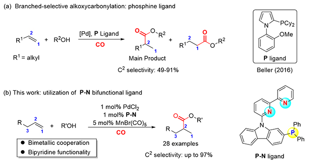 近日,中国科学院兰州化学物理研究所羰基合成与选择氧化国家重点实验室低碳资源催化转化组设计合成了一类含有联吡啶结构单元的咔唑基膦配体(P-N),通过联吡啶基和膦位点分别与不同的金属配位,以期实现双金属协同增强对反应区域选择性的调控。基于PdCl2/MnBr(CO)5/ P-N配体组成催化体系,实现了长链脂肪烯烃的高选择性转化,得到了“马氏规则”的支链羧酸酯产物(C2 selectivity)。脂肪族烯烃和芳香族烯烃均能高选择性地生成支链羧酸酯(13种烯烃:产率:80%-91%,C2 selectivity:51%-97%)。此外,不同种类的醇也有很好的底物适用性(16种醇:产率:70%-95%,C2 selectivity:72%-85%)。