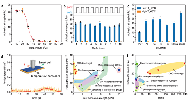 DMCS-水凝胶表现出优异的温度响应性和可逆黏附性能,润滑和黏附状态可自由切换,适用于各种基材,如木材、铁片、玻璃、硅片和聚对苯二甲酸乙二醇酯(PET)等。最大黏附开关比达240倍,具有良好的循环稳定性。