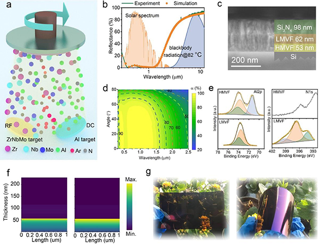 近期,中国科学院兰州化学物理研究所清洁能源化学与材料实验室低碳能源材料课题组高祥虎研究员、刘刚研究员团队通过磁控溅射方法在普通棉布表面制备了基于高熵氮化物(ZrNbMo-Al-N)的多层薄膜,实现了具有较高光谱选择性的人体热管理织物。研究人员通过建立稳态传热模型发现织物高吸收率和低发射率对人体在低温环境下保温都有贡献,特别是吸收率的优化,能够有效增加在户外光照环境下的保温能力(如图1所示)。