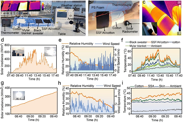 冬季早晨,尽管太阳光强度只有350W m-2,空气温度为7.5 °C,利用该团队研究的高熵保温织物可使人体表面温度提高12 °C(如图3所示)。同时,该织物还保持了棉布的可穿性,实验测试表明,其具有良好的水蒸气透过率、透气性和耐久性。经过不同的洗涤周期,该织物仍保持优异的光学性能。