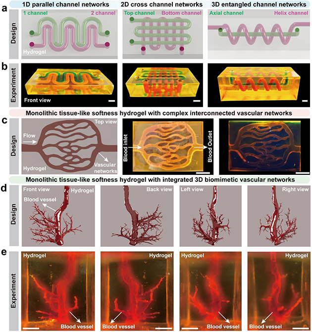 研究人员在弹性水凝胶基质内还制造了各种可调管状拓扑结构的流体多通道网络结构、曲折的仿生多支叉血管网络以及不规则分叉和大小通道的仿生树突状血管网络。