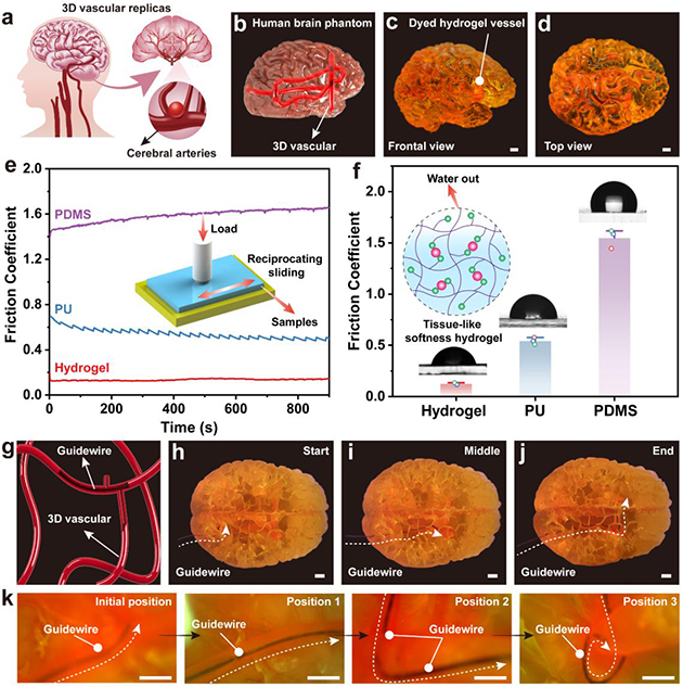 体外模拟测试表明,与传统的硅胶和聚氨酯组织器官模型相比,具有复杂曲折脑动脉的湿滑水凝胶组织器官模型为体外模拟导丝介入过程中提供了优异的水润滑性能,具有更加接近天然血管的理化微环境和仿真结构。