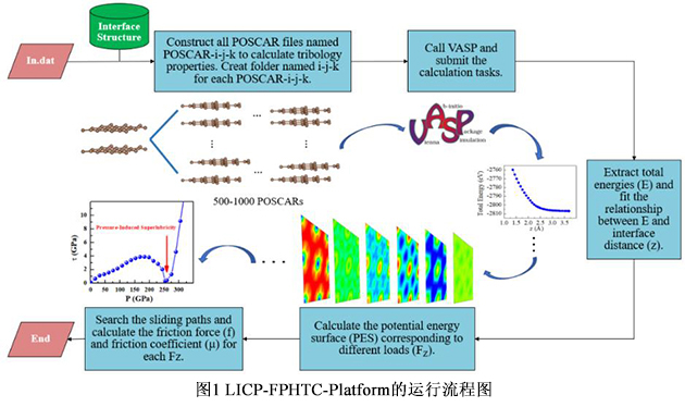 2022年,课题组首次搭建了能够实现自动化建模、计算任务自动提交管理、智能化数据后处理——自动提取计算结果、拟合数据、绘制势能面、搜索最优滑动路径、输出摩擦力、摩擦系数的固体界面摩擦性能高通量计算平台LICP-FPHTC-Platform,实现了固体界面摩擦性能的自动化、高通量计算(摩擦学报2022, 42, 493),并为该平台申请了软件著作权(登记号:2021SR1172689)。