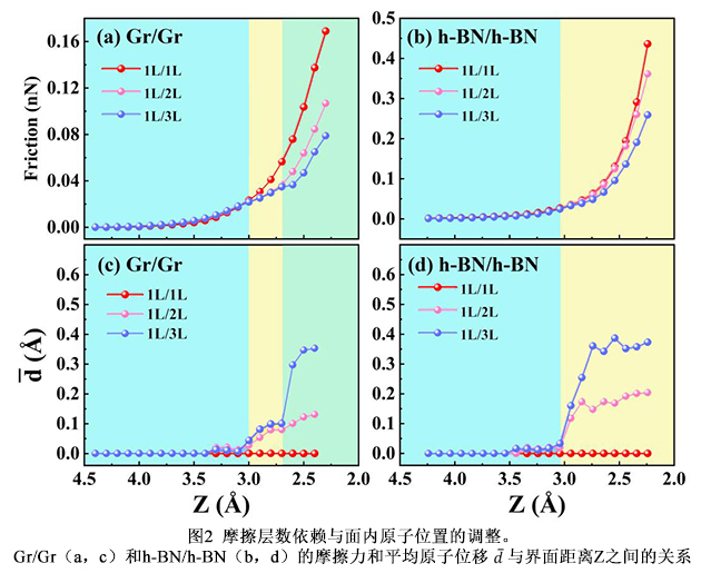 相关工作以“In-plane adjustment of atomic positions and layer-dependent friction in 2D materials”为题发表在Applied Surface Science(2023, 620, 156810)上。兰州交通大学联培硕士生何敏娟为该论文第一作者,兰州化物所何文豪助理研究员和鲁志斌研究员为通讯作者。