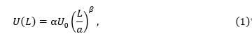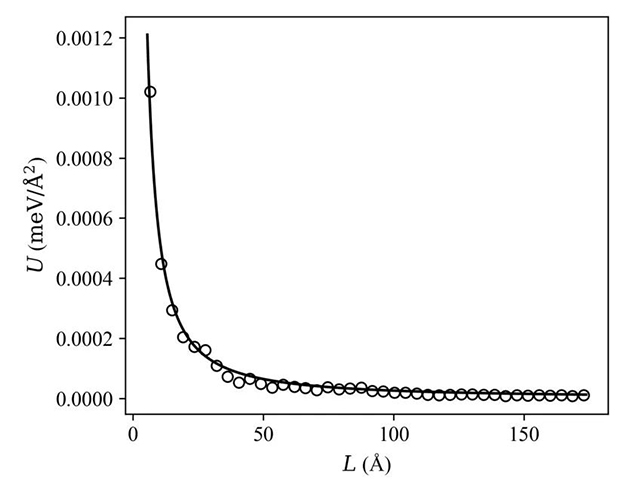 其中,α和β是待定的经验参数,α是组分晶格的周期,L是摩尔纹尺寸。图2表明该公式很好地与分子动力学计算结果相吻合。有限大体系中势能起伏主要由摩尔纹的不规则截断导致,研究人员推导出摩尔纹尺寸、滑块尺寸在旋转体系中对势能起伏U的定量关系: