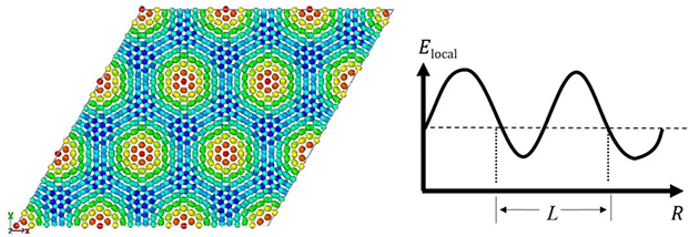 图3 局域势能的示意图。(左)石墨烯/六方氮化硼的每个原子的势能(不同颜色代表不同势能);(右)局域势能可以在一维用sin函数模拟
