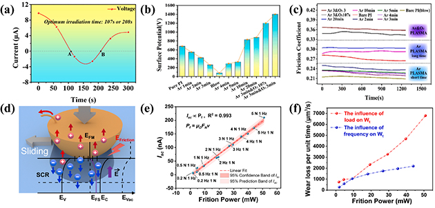 根据电荷产生与变化机制建立摩擦电调控体系是实现界面摩擦磨损调控的关键步骤。研究人员系统研究了等离子体辐照对材料表面成分和微观结构的作用机制,建立了基于等离子辐照的界面摩擦起电调控体系,通过控制等离子辐照的改性参数,实现了不同需求下摩擦副界面摩擦磨损的调控(图2a-c)。研究人员还系统研究了金属-半导体摩擦副异质结界面处的摩擦学行为与摩擦起电性能之间的关系,证实了摩擦伏特效应与摩擦学行为之间的强关联性,为实现半导体摩擦副界面的耐磨防护从摩擦学角度提供了新的策略(图2d-f)。相关成果发表在Nano Energy2022,102,1076912022,99,107310)上。