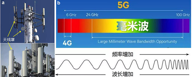 图1. (a) 5G基站和 (b) 5G毫米波频段