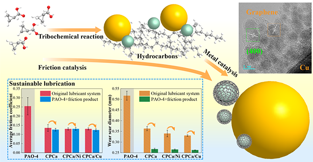 为促使界面间碳基摩擦膜的快速形成,研究人员选取吸附能和表面能较高的活性碳源小分子环丙甲酸(CPCa)与金属粒子复合引入基础油,CPCa在热催化-力剪切作用下快速发生脱氢断键向石墨化转变,生成了含有石墨烯的碳基摩擦膜。同时,石墨化产物促进了润滑体系的可持续润滑效应,提升了体系的润滑寿命。相关成果发表在ACS Sustainable Chemistry & Engineering(2023, 11(6): 2238-2248, DOI: 10.1021/acssuschemeng.2c05639)上,并入选当期补充封面文章(Supplementary Cover Article)。