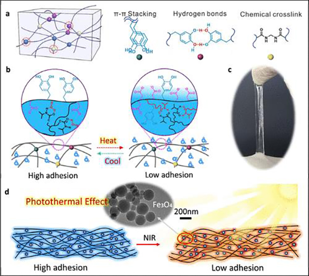 上述研究,成功发展了一种具有光热响应特性的智能水凝胶材料。通过协同整合温敏性聚合物网络与光热纳米颗粒,实现了材料黏附性能的远程精准调控。该材料体系在创面修复、柔性电子器件和软体机器人等新兴领域展现出重要的应用前景,为智能黏附材料的设计提供了新的研究思路。