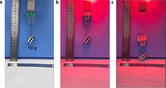 此外,该黏附水凝胶材料表现出优异的智能黏附性能和广泛的基材适用性,实现了从无机到有机材料表面的可逆黏附。为进一步验证黏附水凝胶材料的可控性,研究人员实验演示了水凝胶在不锈钢基板上的光热响应行为,初始状态下可稳定悬挂50g重物,近红外光照后因黏附性能切换而黏附失效。