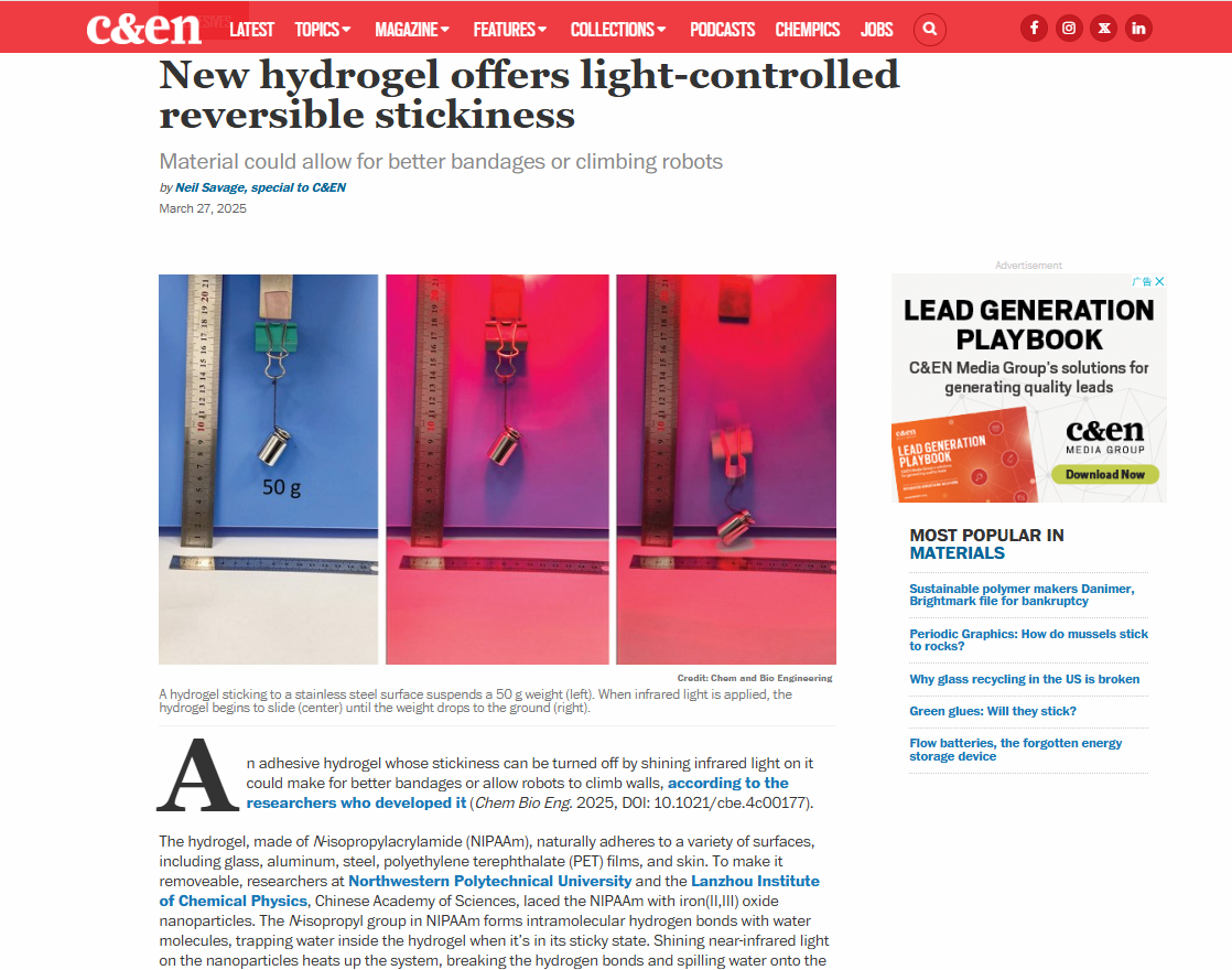 相关研究成果以“Light-controlled Adhesive Hydrogels for On-Demand Adhesion”为题发表在Chem & Bio Engineering上。同时,该成果已被美国化学学会发行的新闻周刊chemical & engineering news(C&EN,全球最具权威和影响力的化学新闻来源之一。)以“New hydrogel offers light-controlled reversible stickiness”为题报道。