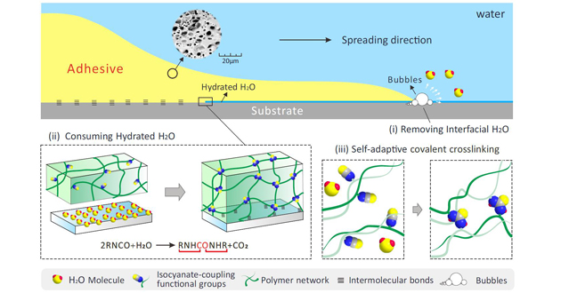 湿黏附在机械工程、海洋技术和医疗科学等领域发挥着重要作用。然而,在固-固界面含水粘接过程中,水分子的存在极易导致粘合失效,这主要是因为界面水阻碍了胶黏剂与基材之间的接触和分子间相互作用的形成。对于界...