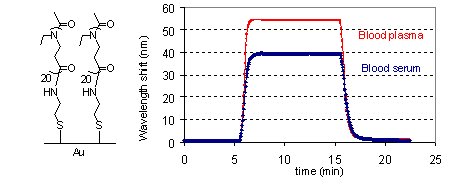 Figure 1. Representative SPR sensorgrams showing very low level of adsorption when the poly(ethyl-?-alanoid)-modified surfaces are exposed to biological fluids.