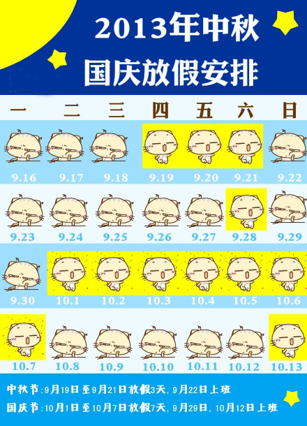 按照《国务院办公厅关于2013年部分节假日安排的通知》(国办发明电〔2012〕33号),现将2013年中秋节和国庆节放假调休日期的具体安排通知如下:
