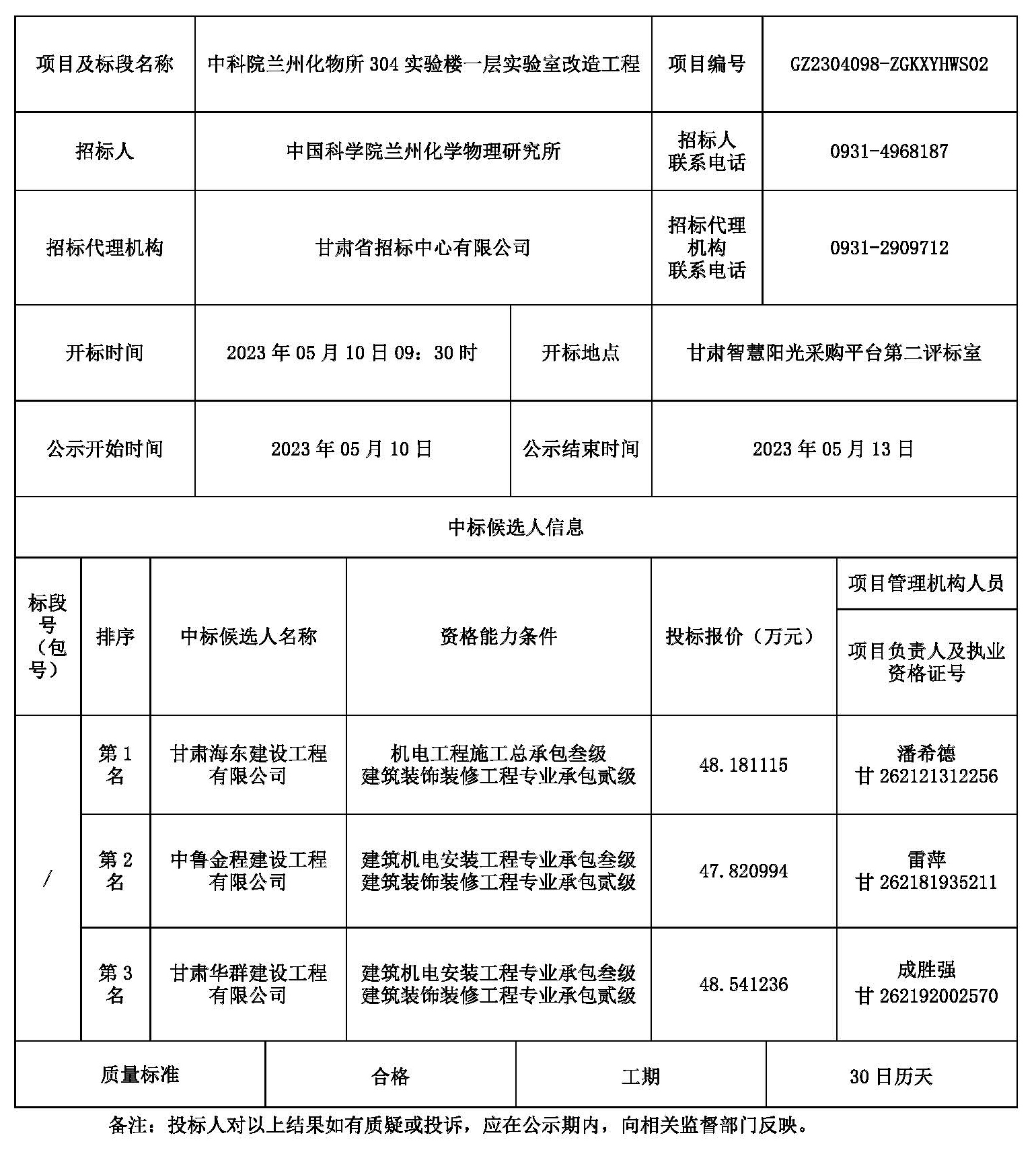 中国科学院兰州化学物理研究所304实验楼一层实验室改造工程中标候选人公示