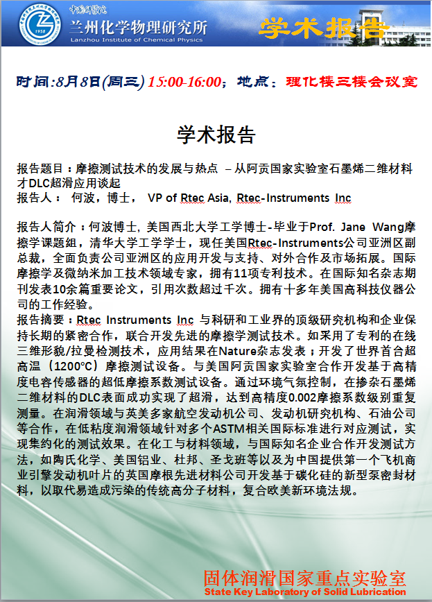 来源:固体润滑国家重点实验室 | 发布时间:2018-08-07 | 【 大 中 小 】