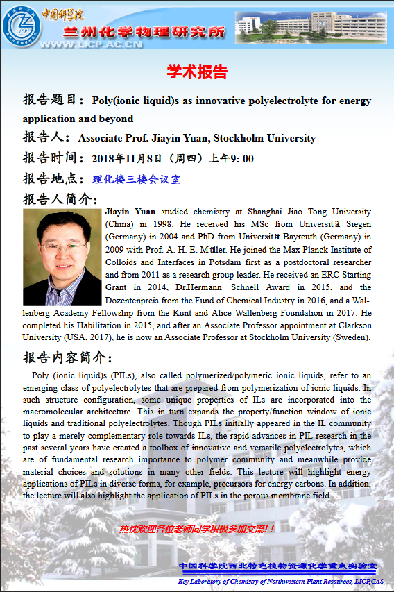 11月8日:Poly(ionic liquid)s as innovative polyelectrolyte for energy application and beyond