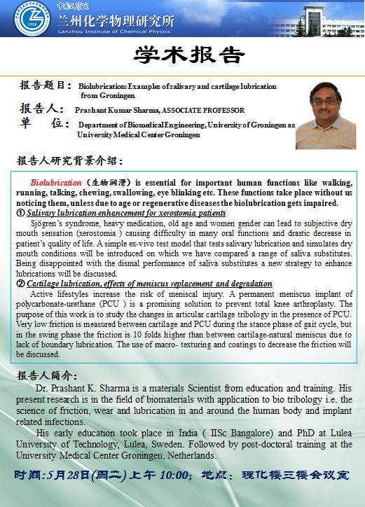 5月28日:学术报告---Biolubrication: Examples of salivary and cartilage lubrication from Groningen