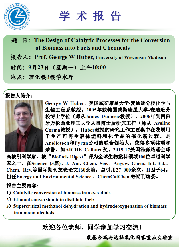 9月23日:学术报告—The Design of Catalytic Processes for the Conversion of Biomass into Fuels and Chemicals