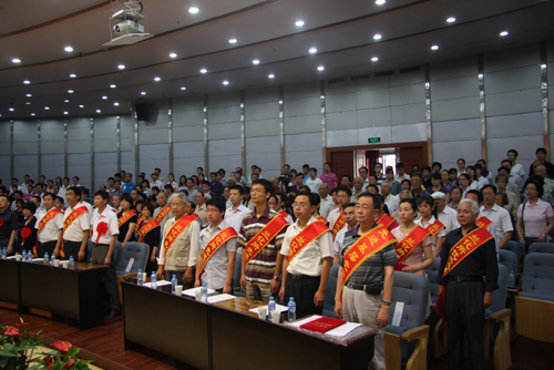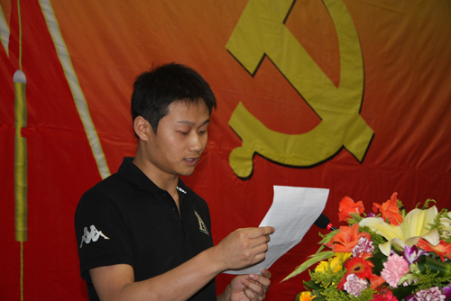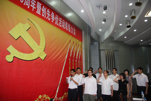 庆祝大会在雄壮的《中华人民共和国国歌》声中拉开帷幕。新入党的高强、陈娟、曹玉梅、张磊、王德胜、姜栋、杨再文、丁奇等8名中共预备党员举起右拳,面向鲜艳的党旗庄严宣誓,表达了为党的事业奋斗终身的决心。