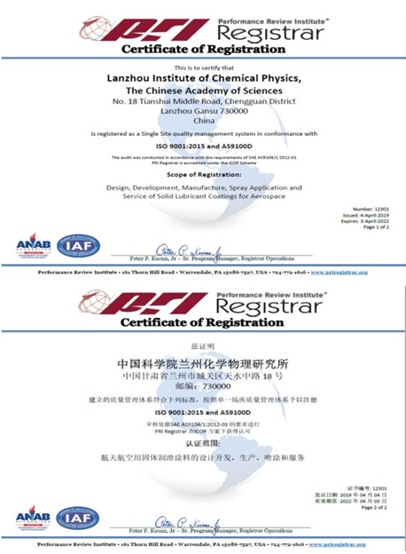 近日,Performance Review Institute(美国质量评审协会)向中国科学院兰州化学物理研究所颁发了AS 9100D国际航天航空质量管理体系认证证书,通过认证范围为“航天航空固体润滑涂料的设计开发、生产、喷涂和服务”,兰州化物所是中国科学院院属单位中第二个通过AS 9100D质量管理体系认证的研究所。