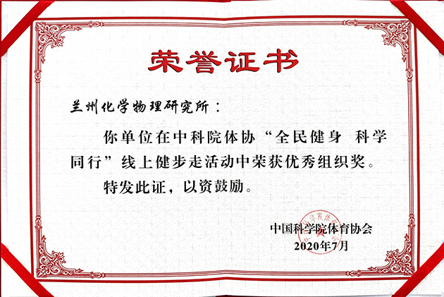 近日,中国科学院工会公布了2020年“全民健身 科学同行”健步走活动优秀组织奖获奖名单,中国科学院兰州化学物理研究所在全院名列第五,荣获“优秀组织奖”。全院共计10家单位获奖。