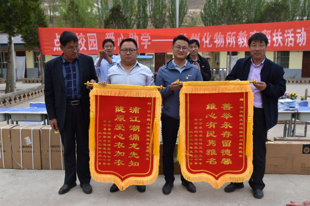 王马山村中学校长王彦杰代表全体师生对兰州化物所和吕龙研究员的爱心捐赠表示衷心感谢,向吕龙研究员和连续两年出资共20万元设立“中科润美”助学金的刘维民院士赠送了锦旗和感谢信,号召全体师生牢记爱心、感恩奋进,将来以优异的成绩回报国家和社会。汉家岔镇党委副书记赵振作和镇教管中心主任王彦瑚对兰州化物所、刘维民院士和吕龙研究员长期以来对王马山村的大力帮扶表示诚挚谢意,并代表汉家岔镇党委政府向刘维民院士和吕龙研究员颁发了捐赠证书。