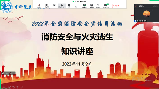 11月9日进行的线上培训讲座邀请了甘肃政安消防宣教中心张旭教官对全所职工、研究生和课题生近500人进行了教育培训。张旭通过消防知识讲解和播放事故案例警示片,讲解了常见火灾的起因、发展特点和严重后果,提醒大家自觉防范消防安全风险;介绍了火灾的预防、扑救和人员火场逃生等方面经验,生活中可能遇到的电信诈骗手段、突发事件的预防和应急处置等。