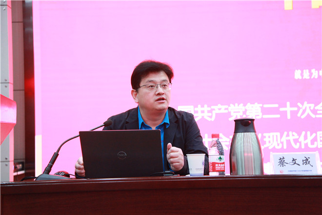 蔡文成作了题为《坚持用党的二十大精神凝心铸魂》的报告。报告从深刻理解和把握党的二十大精神的重大之“义”、历史之“基”、思想之“魂”、战略之“纲”、实践之“本”等5个方面,全面、深入、系统地解读了党的二十大精神,并就进一步增强全面学习宣传贯彻党的二十大精神的政治思想行动自觉提出了意见建议。