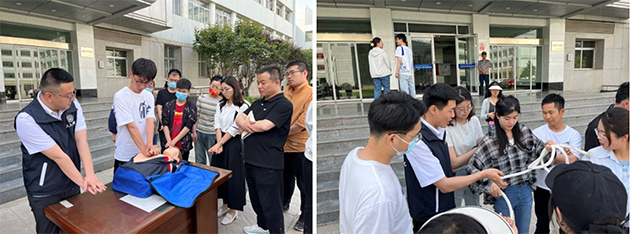 培训结束后,在户外开展了突发事件演练。教官逐一演示了心肺复苏、海姆立克急救法和逃生自救绳索打结,介绍了每个步骤的操作要点,参会人员亲身操作体验,提升了应急自救、互救技能。
