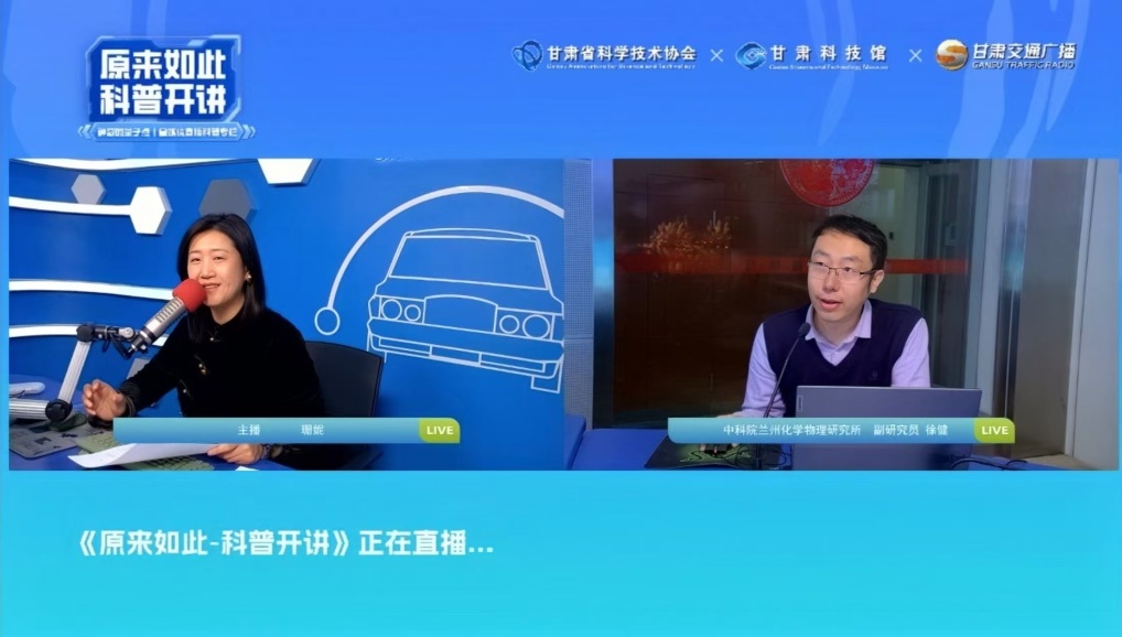 12月13日,中国科学院兰州化学物理研究所徐健副研究员受邀在甘肃交通广播《原来如此—科普开讲》栏目开展了线上直播科普讲座。