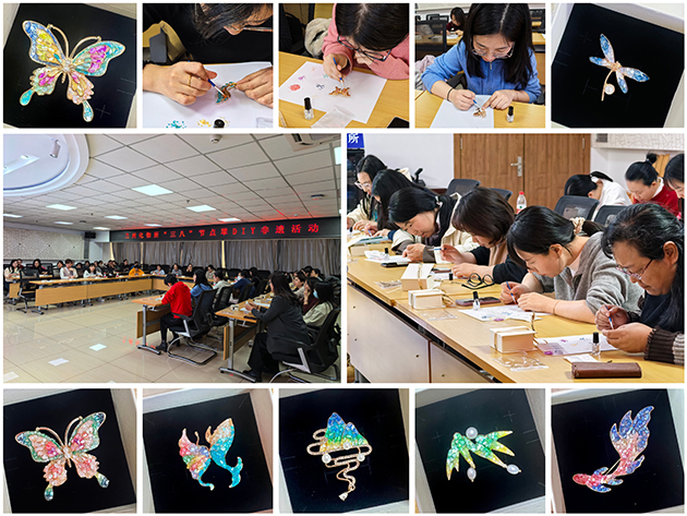 3月13日下午,组织开展了“指尖传非遗”点翠DIY活动。培训老师向大家介绍了中国点翠工艺非物质文化遗产的历史底蕴和文化价值,详细讲解了点翠胸针的制作过程。涂抹亮油、贴贝壳碎片、表面封层、定型……一片片细小的螺钿片镶嵌在胚底,斑斓色彩流动交融,鲜活生动。活动带大家品味了传统工艺的浪漫、领略了沉淀千年的艺术瑰宝。