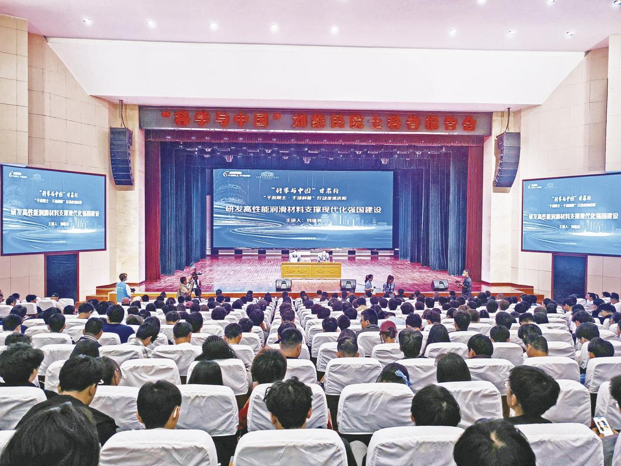 刘维民院士作了题为“研发高性能润滑材料 支撑现代化强国建设”的报告,他用通俗易懂的语言介绍了润滑材料的作用、润滑材料的重要性、航空航天润滑材料、高端装备润滑油脂、核能装备润滑材料技术、轨道交通润滑材料,结合自身科研经历,阐释了科技工作者的职责与使命,为大家揭开了“小材料托举大国重器”的科技密码。他希望新时代青年主动投身知识海洋,系统钻研科学文化知识,精研专业技能,在求知问道中拓宽视野格局,在实践磨砺中锤炼过硬本领,为实现中华民族伟大复兴的中国梦注入蓬勃动能。