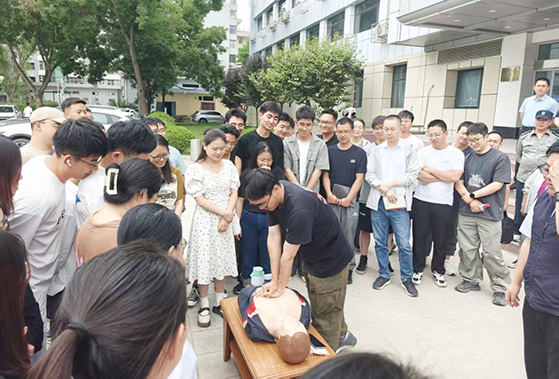 活动邀请北京卫民安消防教育咨询中心甘肃分中心石昊田教官进行了消防安全培训,详细讲解了常见火灾特点、公共灭火器材和应急逃生用具的使用。培训结束后在化物楼前进行了消防灭火演练,展示了紧急情况下心肺复苏、海姆立刻急救法和止血包扎等实用技术要点。随后,大家积极参与演练实践。