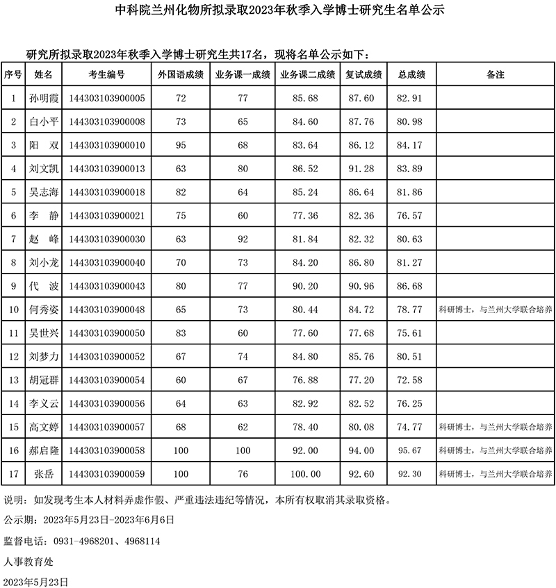 中科院兰州化物所拟录取2023年秋季入学博士研究生名单公示
