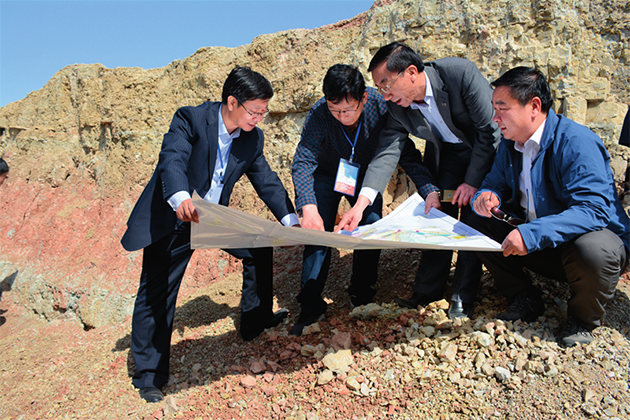 王爱勤(右二)等在甘肃临泽县混维凹凸棒石黏土矿区讨论有序开采工作(2017年4月摄) 受访者供图