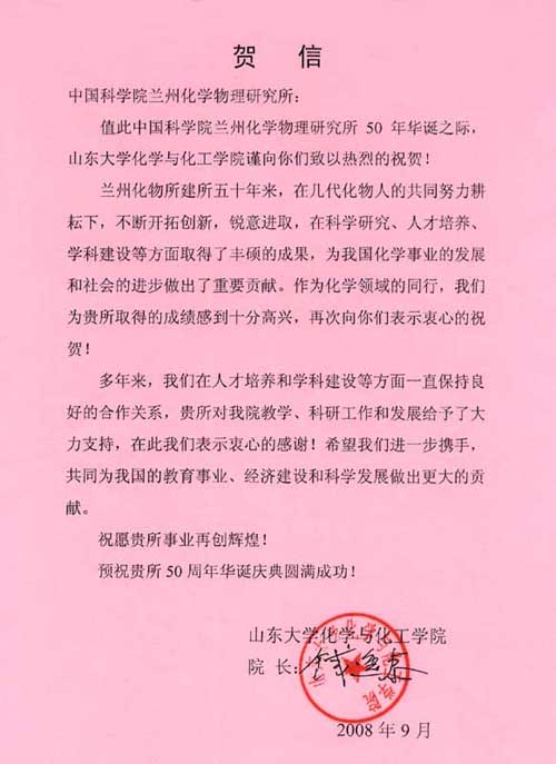 山东大学化学与化工学院贺信