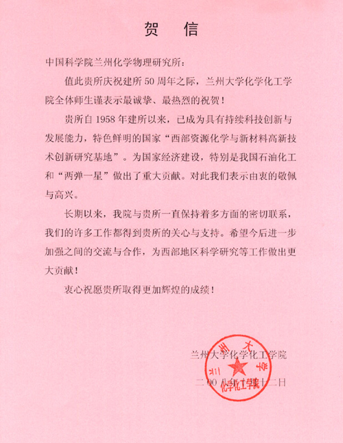 兰州大学化学化工学院贺信