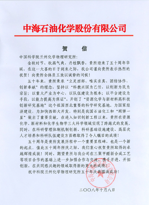 中海石油化学股份有限公司贺信