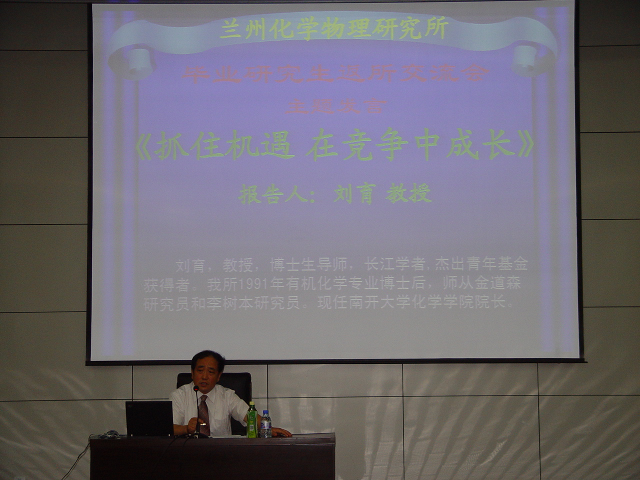 为加强交流与合作,扩大我所的知名度和影响,迎接建所50周年,2008年8月13至14日,兰州化物所研究生处邀请部分在各自领域取得突出成绩的毕业生研究生返所,举办了学术交流与主题报告。所学位评定委员会主席薛群基院士、所长刘维民、党委书记兼副所长赵秀茹、副所长夏春谷和王齐华及部分实验室主任出席了学术交流会,20多位返所毕业研究生以及部分留所工作的毕业研究生参加。