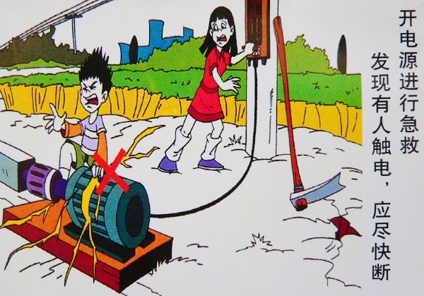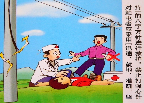 电流对人体的损伤主要是电热所致的灼伤和强烈的肌肉痉挛,这会影响到呼吸中枢及心脏,引起呼吸抑制或心跳骤停,严重电击伤可致残,甚至直接危及生命。 1.要使触电者迅速脱离电源,应立即拉下电源开关或拔掉电源插头,若无法及时找到或断开电源时,可用干燥的竹竿、木棒等绝缘物挑开电线。2.将脱离电源的触电者迅速移至通风干燥处仰卧,将其上衣和裤带放松,观察触电者有无呼吸,摸一摸颈动脉有无搏动。3.施行急救。若触电者呼吸及心跳均停止时,应做人工呼吸和胸外按压,即实施心肺复苏法抢救,另要及时打电话呼叫救护车。4.尽快送往医院,途中应继续施救。