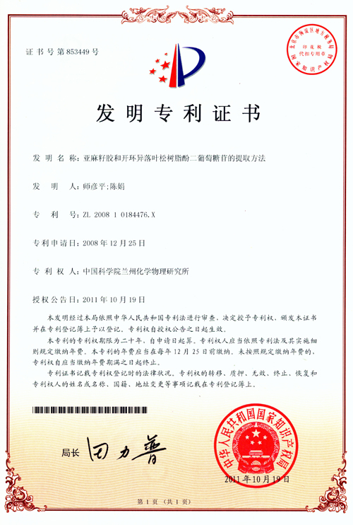 由中国科学院兰州化学物理研究所中科院西北特色植物资源化学重点实验室(甘肃省天然药物重点实验室)药物化学成分研究组发明的专利“亚麻籽胶和开环异落叶松树脂酚二葡萄糖苷的提取方法”,于近日获国家发明专利授权(专利号:ZL200810184476.X)。