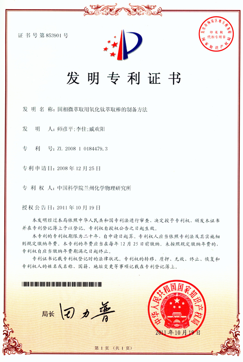 中国科学院兰州化学物理研究所中科院西北特色植物资源化学重点实验室(甘肃省天然药物重点实验室)药物化学成分研究组研发出一种新型氧化钛中空纤维萃取棒,可用于固相微萃取,该项技术于近日获得国家发明专利授权(“固相微萃取用氧化钛萃取棒的制备方法”,专利号:ZL200810184479.3)