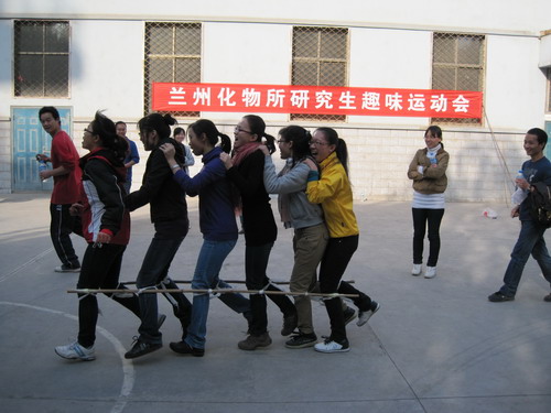 11月5日下午,兰州化物所举行了以“团结奋进 跨越发展 强身健体 协作创新”为主题的2011年度研究生趣味运动会。此次运动会共有六个班级参加。比赛设有螃蟹赛跑、托球跑、摸石过河、袋鼠跳运球投篮、传球接力跑、赛龙舟和拔河比赛七个项目,突出了趣味性与参与性。